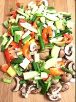 Once the chicken is partially cooked, add the chopped vegetables and toss until they become soft.