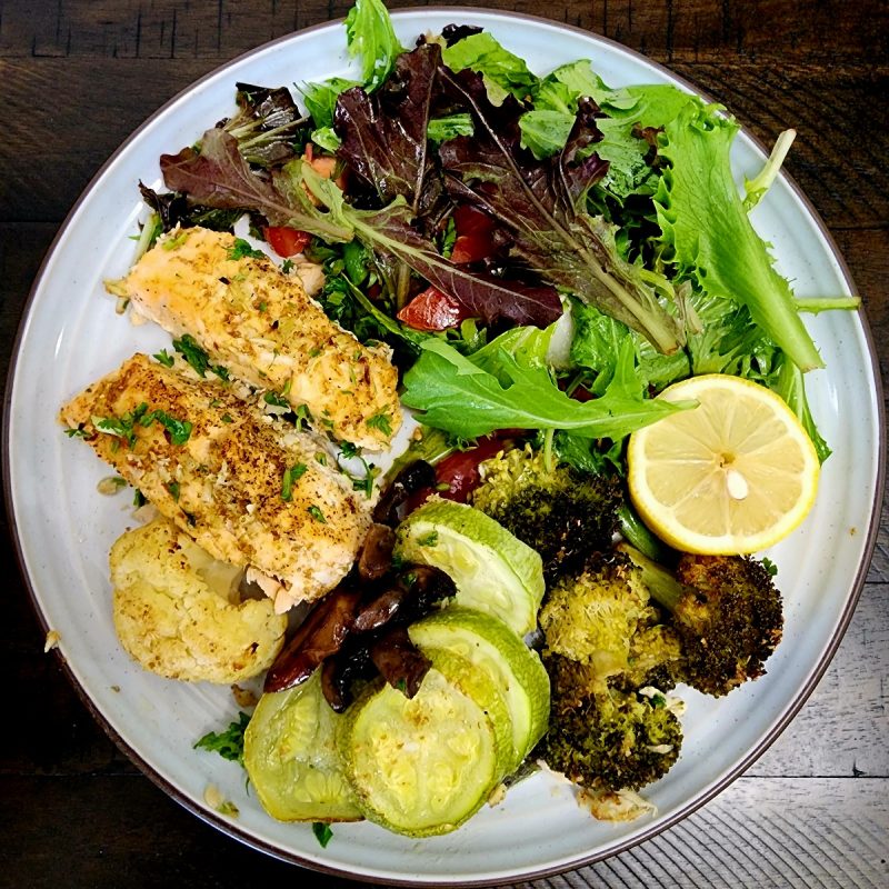 Serve the salmon and vegetables on plates and offer lemon wedges on the side.